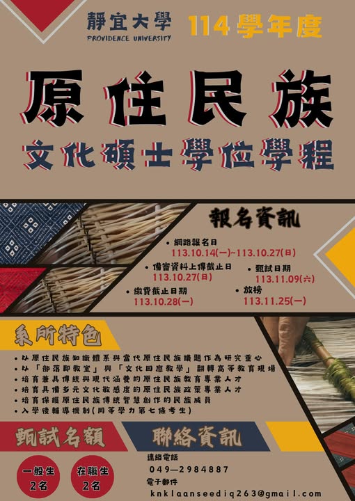 📣📣114學年度靜宜大學原住民族文化碩士學位學程甄試招生中📣📣