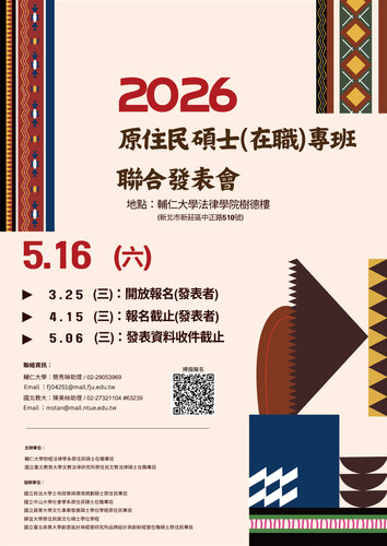 「原住民碩士(在職)專班聯合發表會」訂於2026年5月16日(六)舉辦,請有意願參與者於2026年4月15日(三)前報名,謝謝。